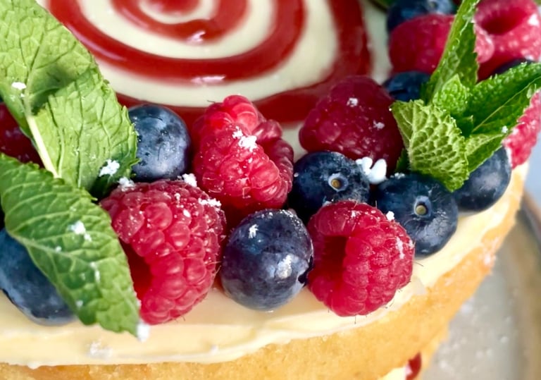 Light, fluffly vanilla sponge with vanilla buttercream and strawberry or raspberry jam filling.